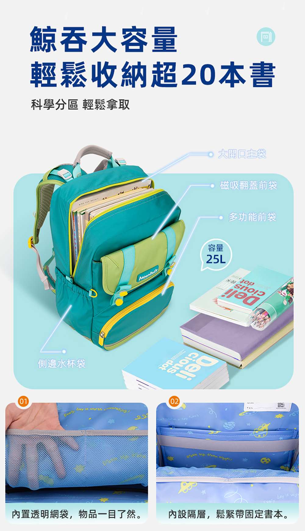 ● 25公升大容量,可裝20本書