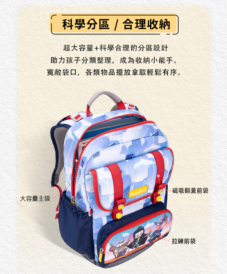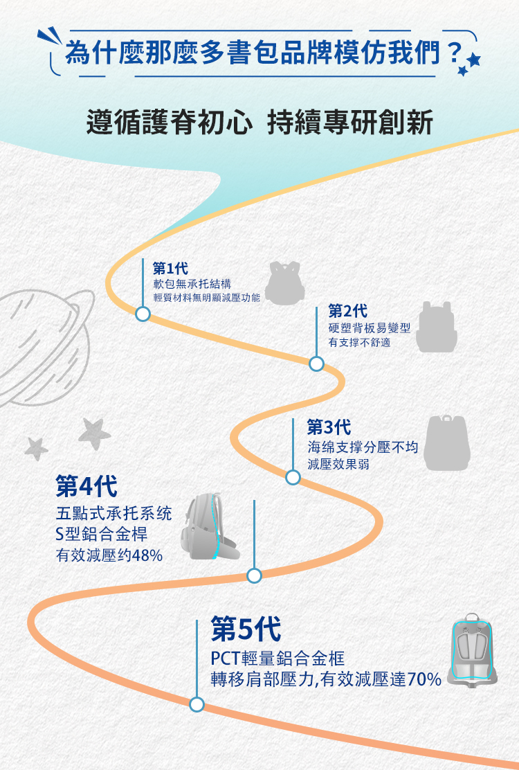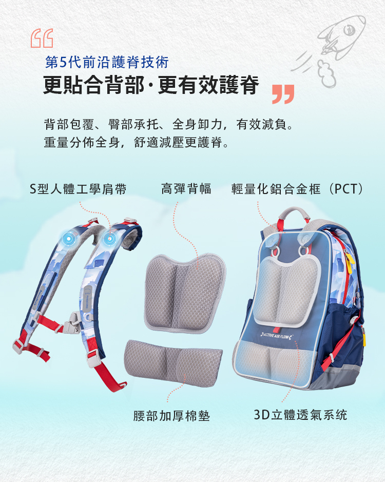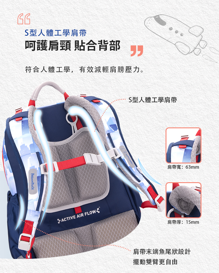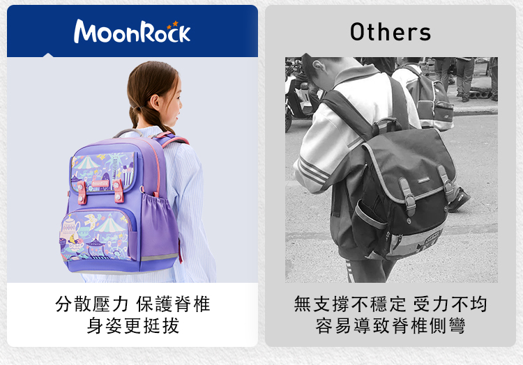 ● 內置的書本自動傾向背部,重量貼近背部而不往後傾