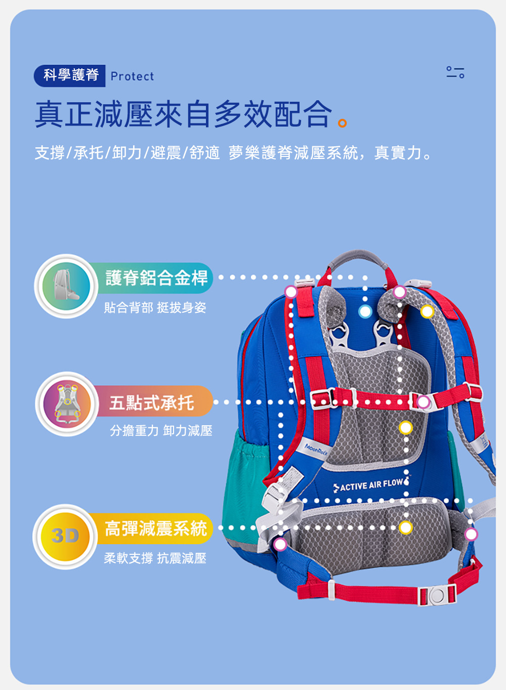 ● 五點式承托設計,有效減壓48%的重量