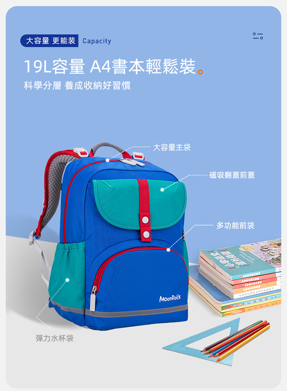 ● 19公升大容量,可裝20本書
