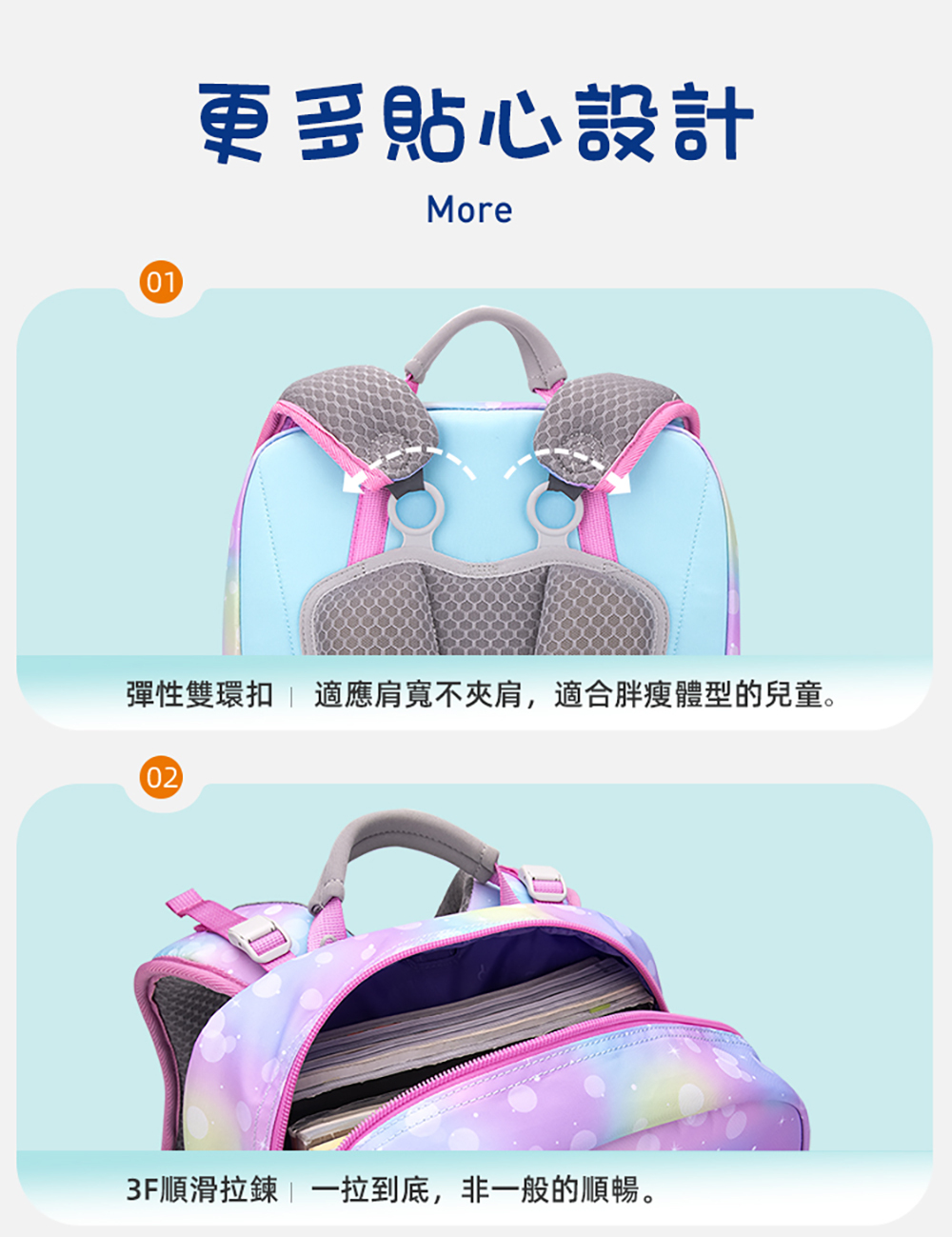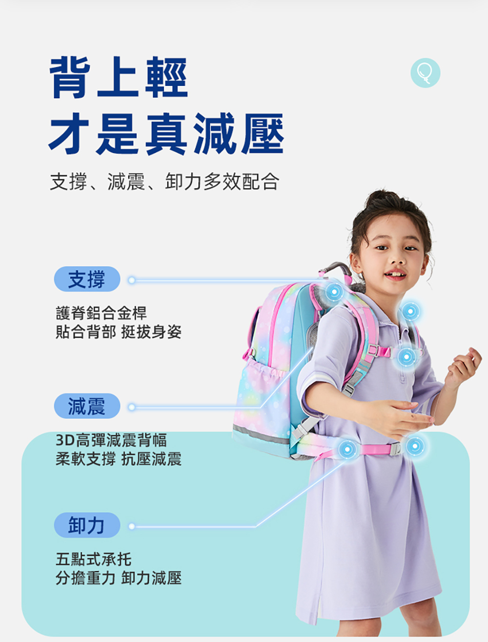 ● 3D立體S型肩帶,減震緩衝、護脊卸力
